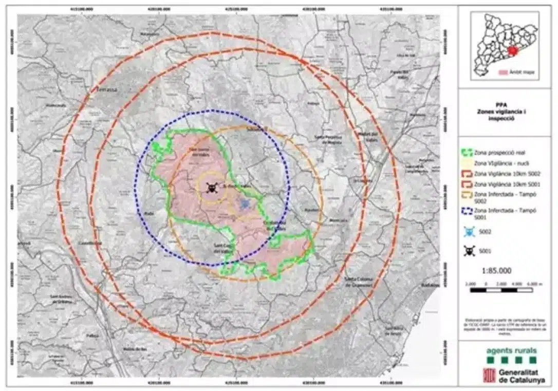 Los veterinarios oficiales recibieron el aviso tras localizarse los cadáveres de dos jabalíes a menos de un kilómetro de distancia, en las inmediaciones del campus de la Universidad Autónoma de Barcelona. La zona ha quedado incluida dentro del manual práctico de operaciones contra la PPA, que contempla la delimitación de un área infectada, la búsqueda activa de más restos de animales y la prohibición de actividades cinegéticas para evitar desplazamientos que puedan dispersar el virus.