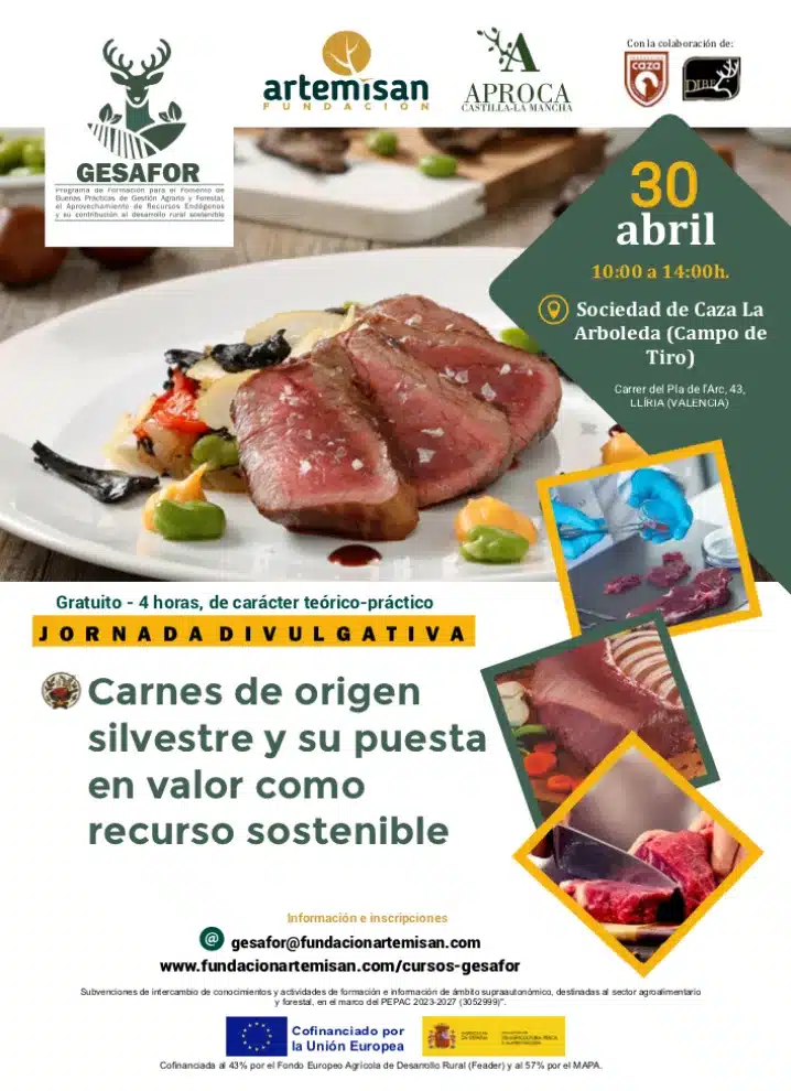 El proyecto formativo GESAFOR llega a Valencia con un curso sobre «Carnes de origen silvestre y su puesta en valor como recurso sostenible» el próximo día 30 de abril en Llíria, de la mano de Fundación Artemisan y APROCA Castilla-La Mancha, con la colaboración de la Federación de Caza de la Comunidad Valenciana y Cárnicas DIBE.