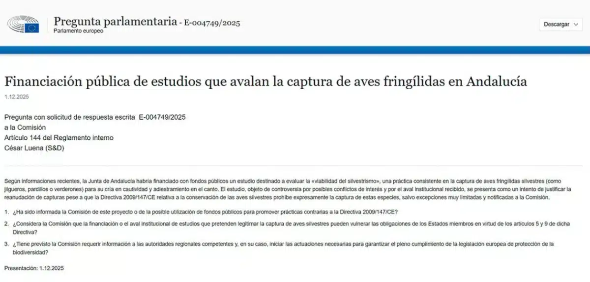 El pasado 1 de diciembre, el eurodiputado socialista César Luena registró una pregunta parlamentaria en la que critica los trabajos científicos destinados a analizar la viabilidad de la cría en cautividad como alternativa a las capturas tradicionales en el silvestrismo. Estos estudios están siendo desarrollados por entidades independientes a instancias del Gobierno andaluz.