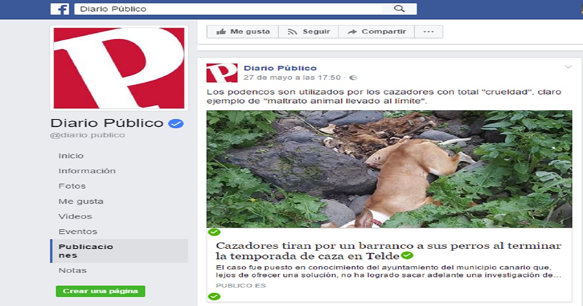 El diario Público ha hecho viral una noticia falsa que fue publicada el pasado mes de febrero por TeldeActualidad.com y en la que se asegura sin pruebas ni datos contrastados que los «cazadores tiran por un barranco a sus perros al terminar la temporada de caza en Telde», tal como aparece en su titular.