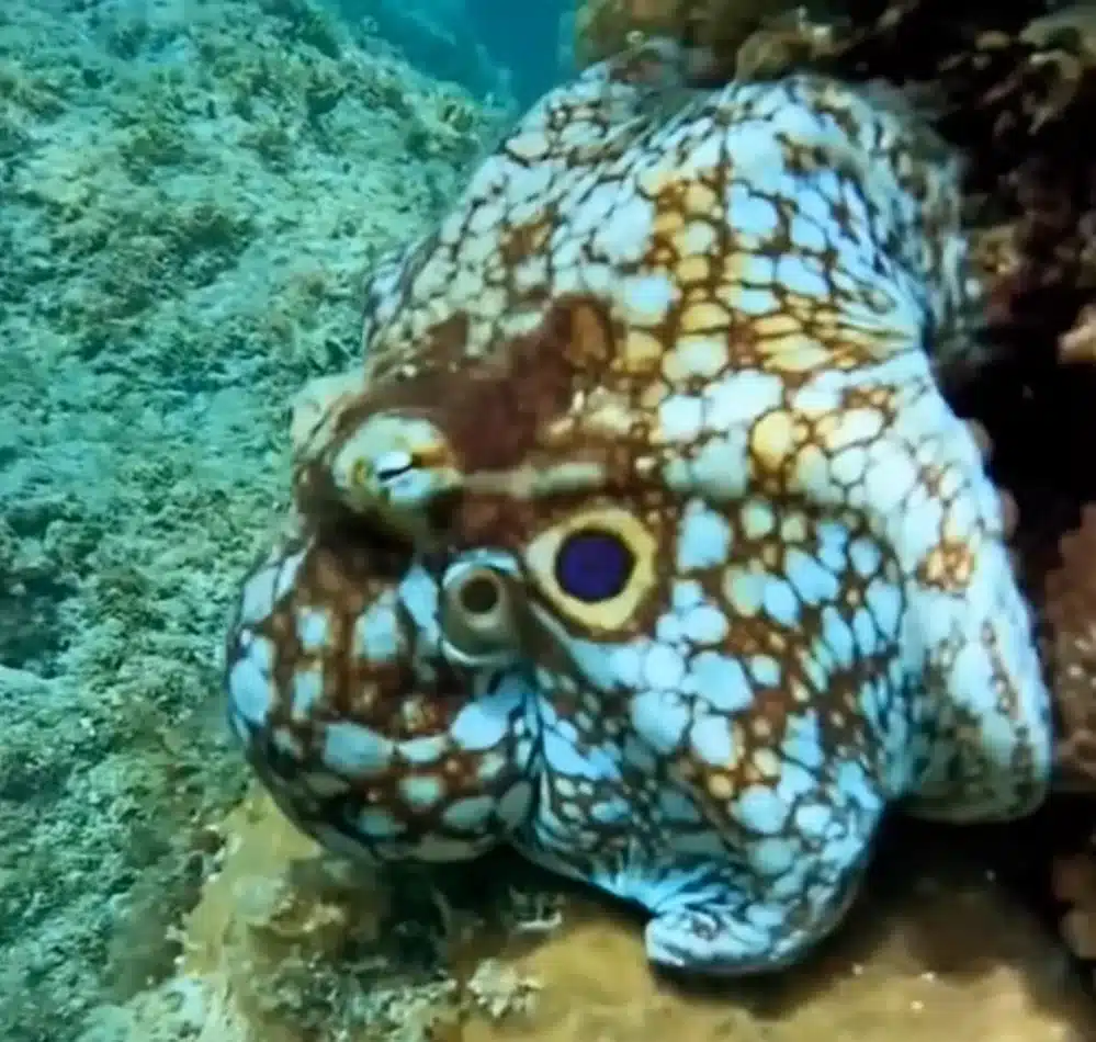 Las imágenes difundidas por la cuenta @pildoranews muestran a un pulpo con el cuerpo inflado y la piel cubierta por un patrón moteado azul y marrón, con una forma tan perfectamente redondeada y simétrica que asemeja una cabeza monstruosa, con ojos saltones y mirada penetrante. La escena es tan desconcertante que algunos usuarios han llegado a preguntarse si lo que veían era real o una creación digital.