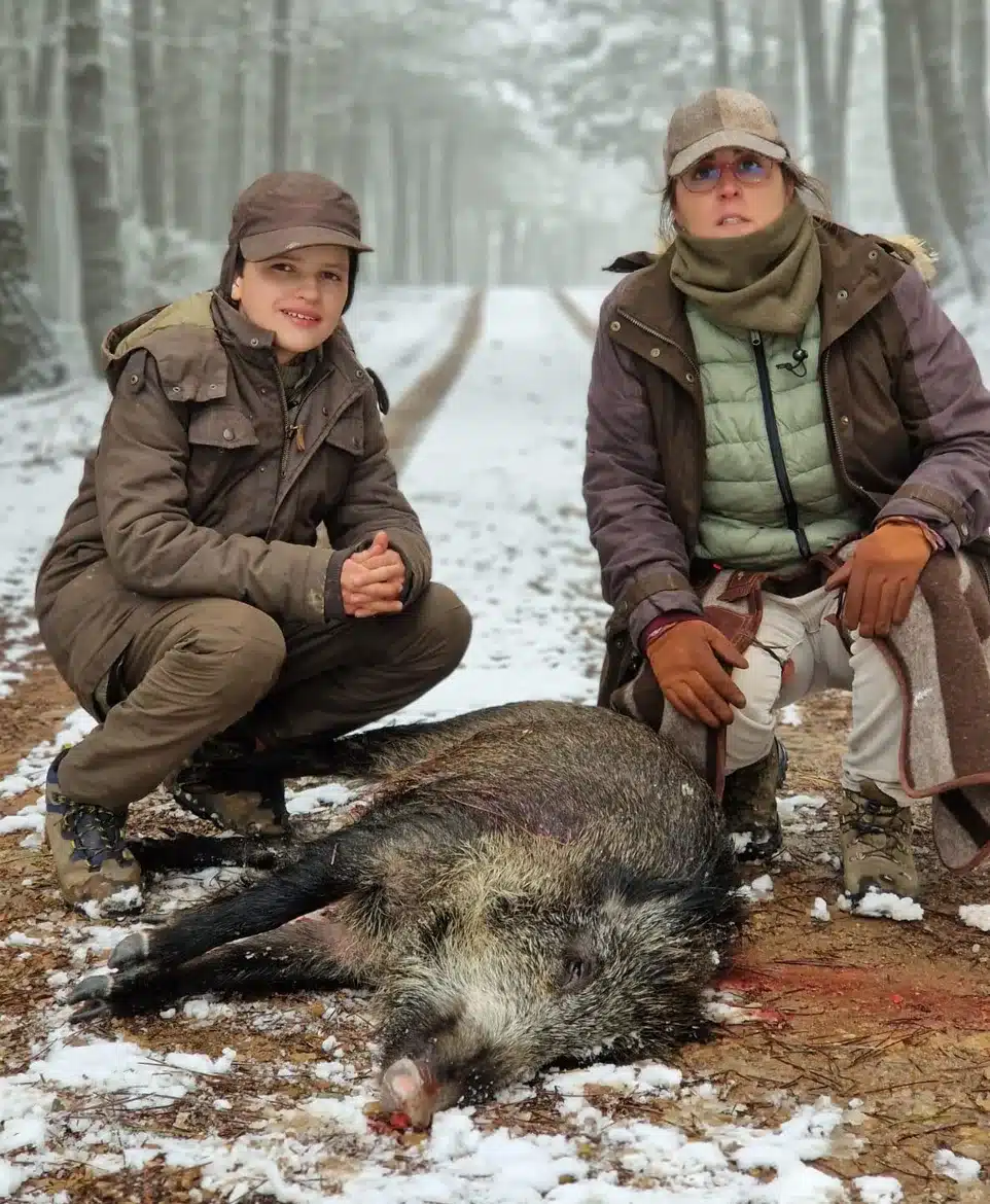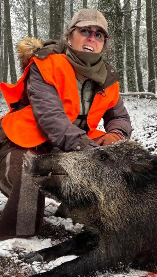 Los minutos pasan completando las horas. Dos tazas de caldo bien caliente atemperan mi espíritu. Voy bien preparada, mi cuerpo no se estremece; solo mi faz pide clemencia. El viento de cara choca contra mi frente y mis mejillas. Y de repente la veo: una cochina trota entre los pinos, silenciosa es su huida, la alfombra que pisa es su aliada. Gorra, capucha, orejeras y cuello polar quieren esclavizar mis movimientos a la hora de encararme; mi ansia y afición los doblegan. Con el rifle atornillado a mi hombro y la vista sumergida en el visor, la sigo entre los troncos hasta encontrar el lugar propicio para enviarle una misiva de muerte.
