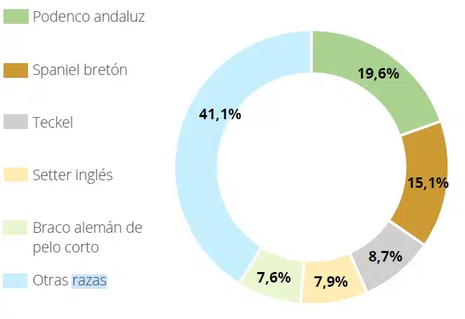 También figuran en el listado otras razas como el setter inglés (7,9%) y el braco alemán (7,6%), mientras que un 41,1% corresponde a otras razas menos comunes. Esta diversidad refleja el alto grado de especialización que existe dentro del mundo de la caza con perros dependiendo de la modalidad que se practica.