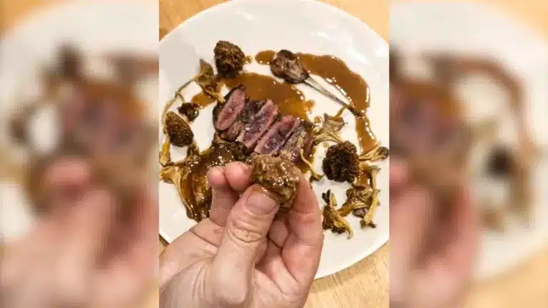 Lo siguiente que hay que hacer es partir la cabeza a la mitad y marcar las pechugas salpimentadas en una sartén con aceite y el fuego alto. El último paso será emplatarlo todo con el caldo preparado y rellenar unas colmenillas con el paté hecho de los interiores. Un poco de sal gorda sobre la pechuga y a disfrutar.