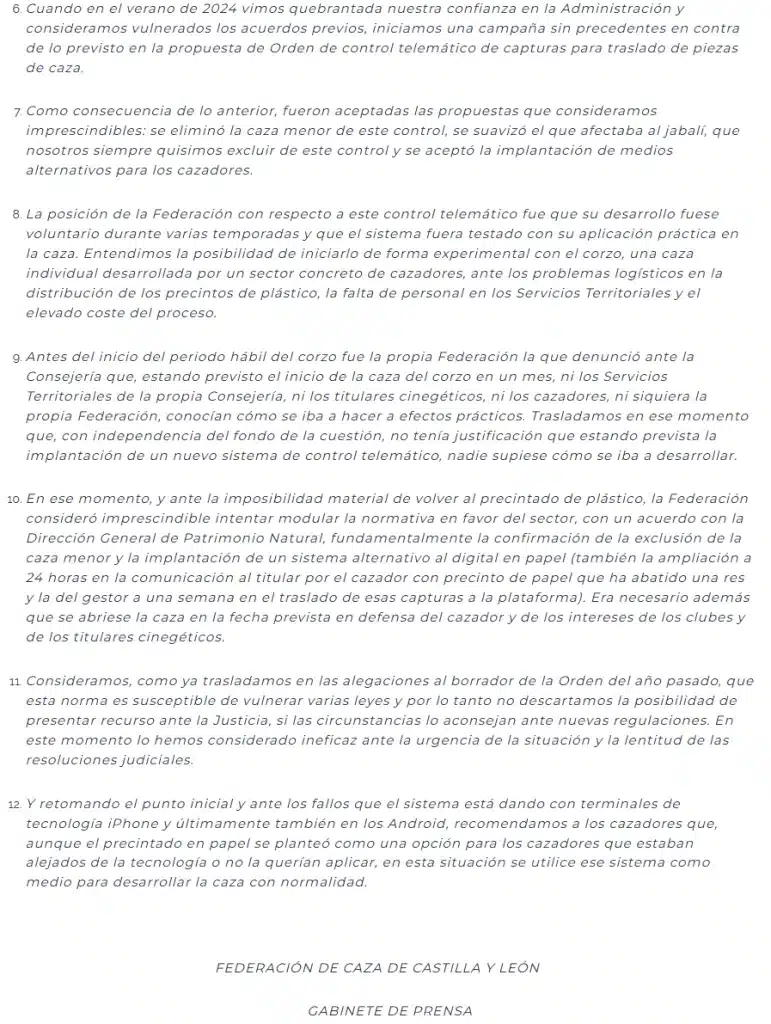 Según el comunicado, el sistema no estaba preparado para su implantación efectiva, y ni los Servicios Territoriales ni la propia Consejería sabían cómo aplicarlo a efectos prácticos. La Federación destaca que esta falta de planificación se produjo apenas un mes antes del inicio de la temporada del corzo, una modalidad individual con gran seguimiento en la comunidad.
