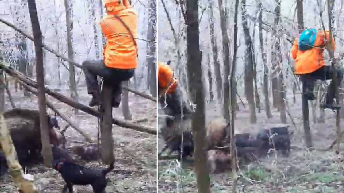 Los cazadores no han parado de compartir unas imágenes en las que se puede ver cómo un tremendo jabalí rodeado de varios perros arremete contra los cazadores que hay a su alrededor y les obliga a trepar como pueden a un árbol. Uno de los hombres se escurre y golpea su espalda sobre el lomo del animal e incluso, cuando intenta huir, tropieza y se cae de nuevo a merced del macareno.