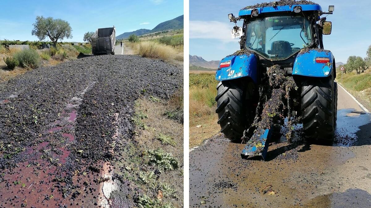«Se rompió el enganche camino de la bodega y se salió la uva», relata sobre lo acaecido en el municipio murciano. En las imágenes se puede ver la uva esparcida por toda la calzada e incluso por encima del tractor, que tuvo que frenar de forma brusca y la carga se le vino encima.