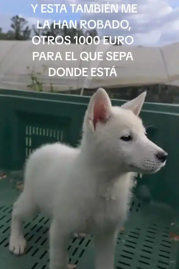 En el segundo, muestra a la cachorra desaparecida y repite su oferta: «Y esta también me la han robado. Otros 1.000 euros para el que sepa dónde está».