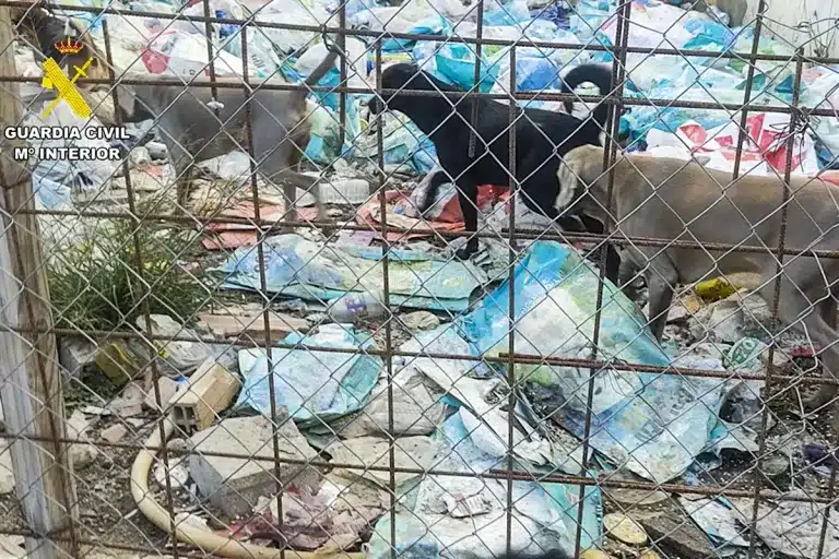 La Guardia Civil ha desarticulado en el municipio de Macael (Almería) un supuesto refugio de animales que en realidad ocultaba un criadero ilegal en condiciones dantescas. En su interior, tres perros aparecieron muertos y otros 19 se encontraban en un avanzado estado de abandono, sin alimento, sin agua potable y rodeados de basura. La operación se ha saldado con la investigación de dos personas por presuntos delitos de maltrato animal, abandono con resultado de muerte y estafa, según ha informado EFE.