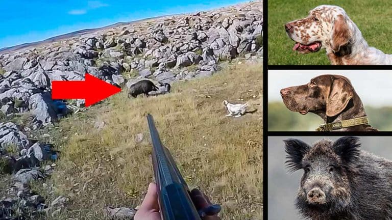 El vídeo de un cazador que corre hasta llegar a una hondonada donde sus dos perros de muestra han acorralado a un gran jabalí no para de compartirse en las redes sociales.