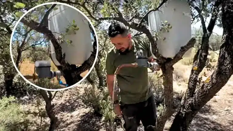 Tal y como muestra en un vídeo que ha compartido en su canal de YouTube, el sistema parte de algo tan sencillo como dos bidones de agua transportados en una furgoneta. Al llegar al paraje escogido, el protagonista muestra cómo colocan una garrafa equipada con un grifo en la parte baja, que queda firmemente sujeta entre las ramas de un árbol.