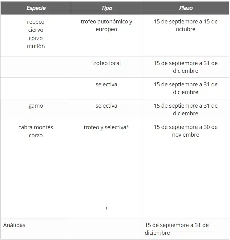 El sorteo incluye diferentes modalidades en función de la especie y el tipo de permiso. Para rebeco, ciervo, corzo y muflón, el plazo para los permisos de trofeo autonómico y europeo estará abierto del 15 de septiembre al 15 de octubre, mientras que para los de carácter local o selectivo se extiende hasta el 31 de diciembre. El gamo podrá solicitarse en la modalidad selectiva durante ese mismo periodo.