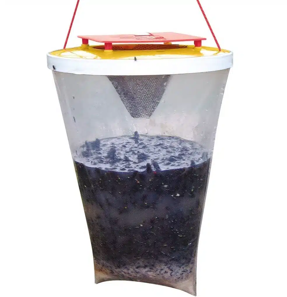 Este modelo de trampa no necesita electricidad ni productos tóxicos para acabar con los insectos. Su funcionamiento se basa en un atrayente biológico que, mezclado con agua, emite un olor irresistible para las moscas. Una vez dentro, ya no pueden salir. El fabricante asegura que puede capturar hasta 20.000 moscas en una sola temporada, y las opiniones de cientos de compradores parecen confirmarlo.