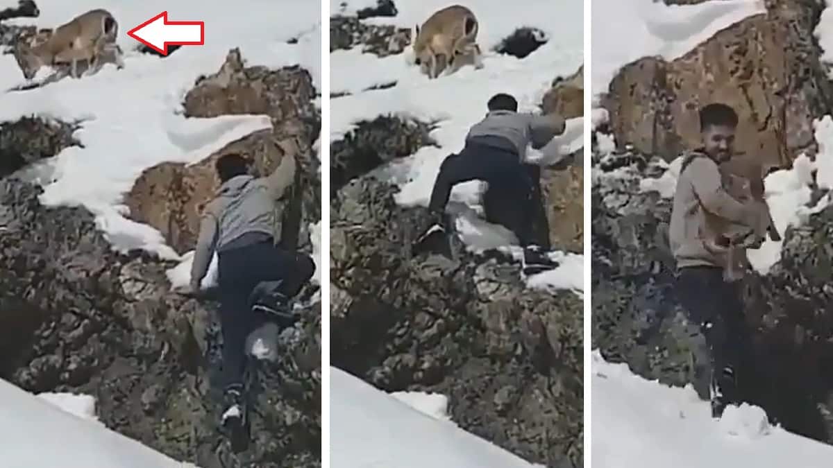En las siguientes imágenes se ve cómo un hombre camina sigilosamente y se sube a una piedra mientras una joven cabra se alimenta entre la nieve. Aprovechando que el animal en un momento determinado mira hacia otro lado, el hombre se abalanza y la captura. Las imágenes han provocado multitud de reacciones, por un lado quienes se lo han tomado a broma y por otro quienes piensan que no debería haber molestado al animal.