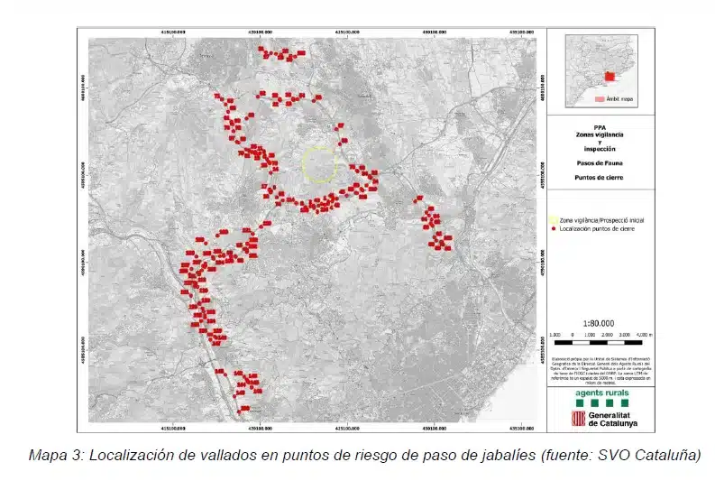 En paralelo, se ha reforzado el sistema de aislamiento físico mediante vallados. Se aprovechan infraestructuras ya existentes en carreteras y vías férreas, con especial atención a los corredores habituales de paso de jabalíes. Destaca la creación de una segunda barrera de contención alrededor de Collserola, utilizando la AP-7 y la A-2, así como el refuerzo de la doble barrera en la C-58 y la red de Cercanías.