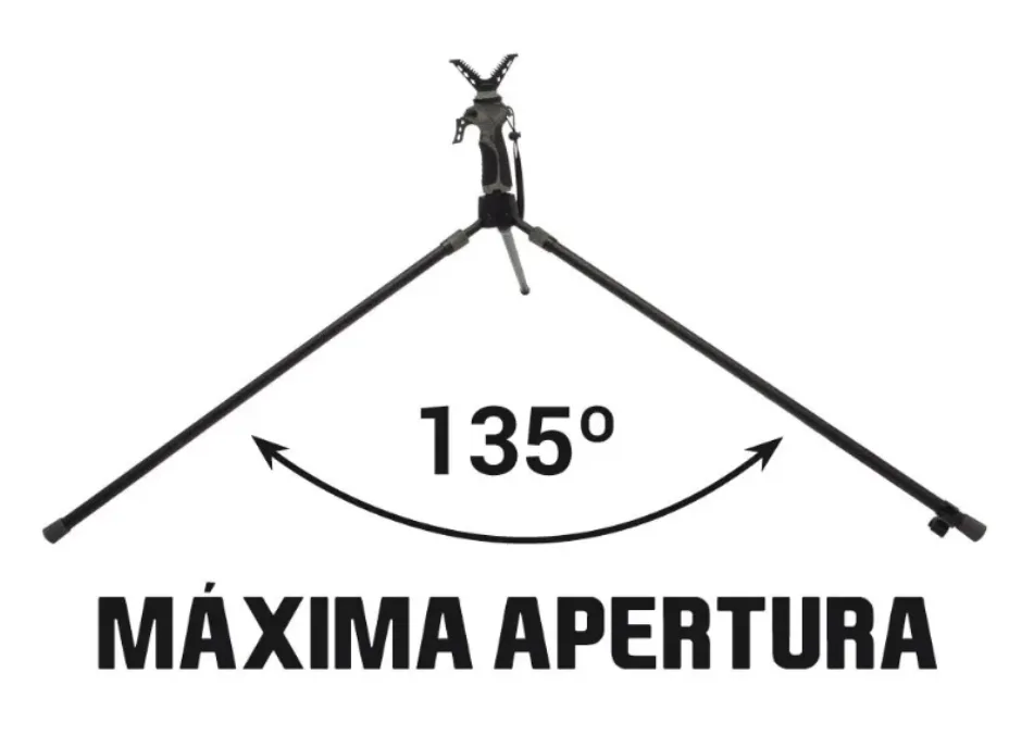 Otro de sus puntos fuertes es la horquilla giratoria en 360 grados, que aporta fluidez al seguimiento del animal sin necesidad de levantar el arma. Este detalle, aparentemente sencillo, marca una gran diferencia en situaciones reales de caza. Las patas de aluminio, robustas y estables, ofrecen además la posibilidad de abrirse hasta 135 grados. Esto permite adaptarse a terrenos complicados o disparar desde posiciones más bajas, manteniendo siempre una buena base de apoyo.