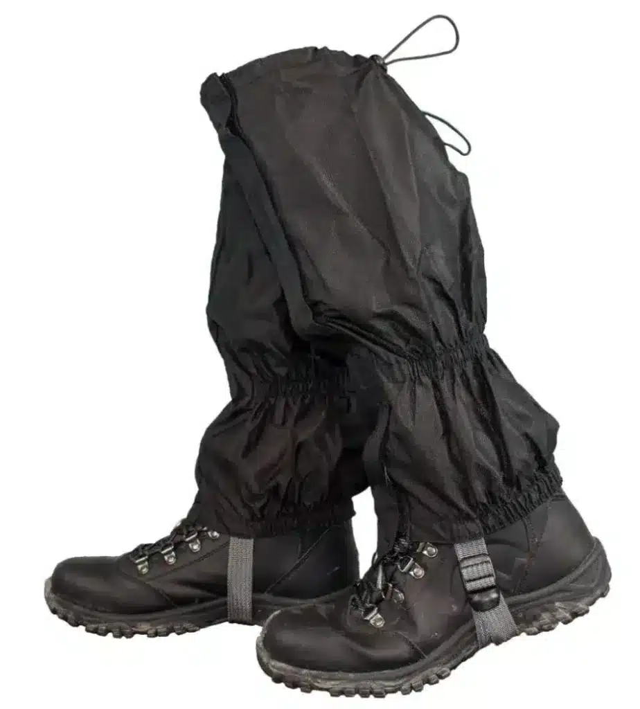 Estas polainas están fabricadas con un tejido transpirable, impermeable y resistente al viento, lo que las hace especialmente útiles en zonas de matorral denso o vegetación alta. Cuentan con un cierre de velcro y cremallera trasera que impide que se desplacen durante la marcha, y una banda elástica en la parte inferior que sella completamente el acceso a la pierna.