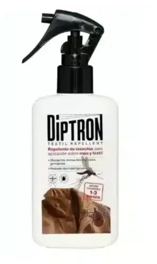 Para reforzar su efectividad, muchos combinamos estas polainas con un repelente específico. Uno de los más utilizados es Diptrón, un producto que actúa como barrera olfativa y desorienta a los parásitos antes de que logren siquiera acercarse. Aplicado sobre las polainas antes de la salida, consigue una doble protección: física por el tejido y química por el olor repelente.