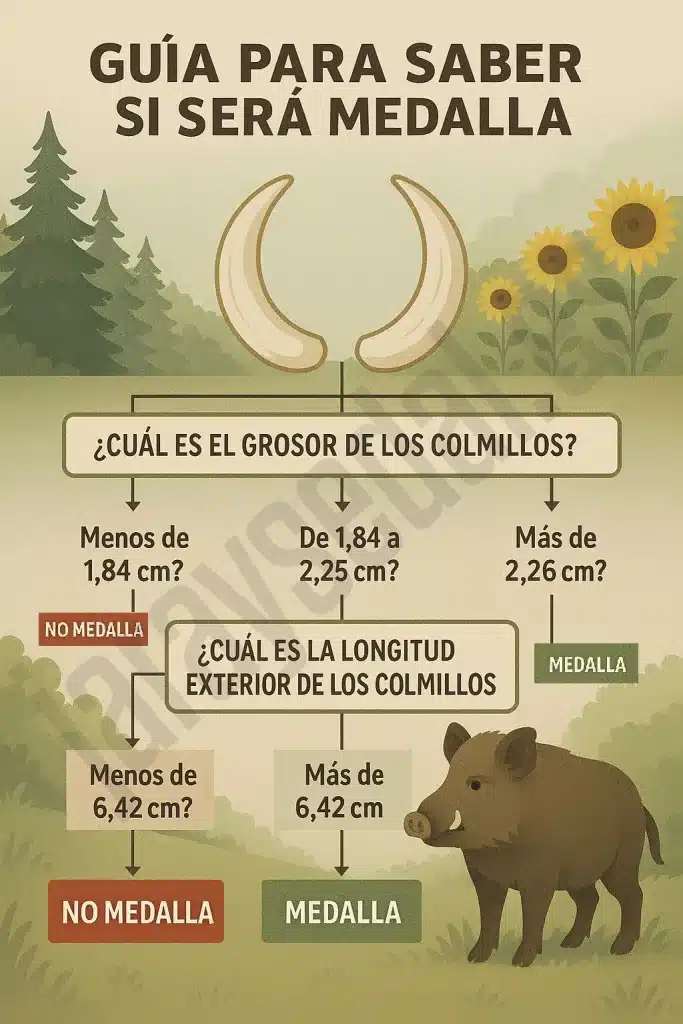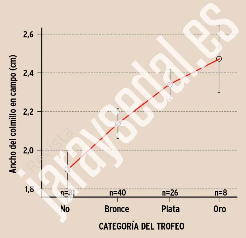 Un gráfico elaborado con las medidas reales confirma esta progresión: el grosor medio de los colmillos aumenta de forma clara desde los jabalíes sin medalla hasta los que alcanzan el oro. Aunque no es una regla exacta, sí es una herramienta muy útil para estimar el valor del trofeo en campo.