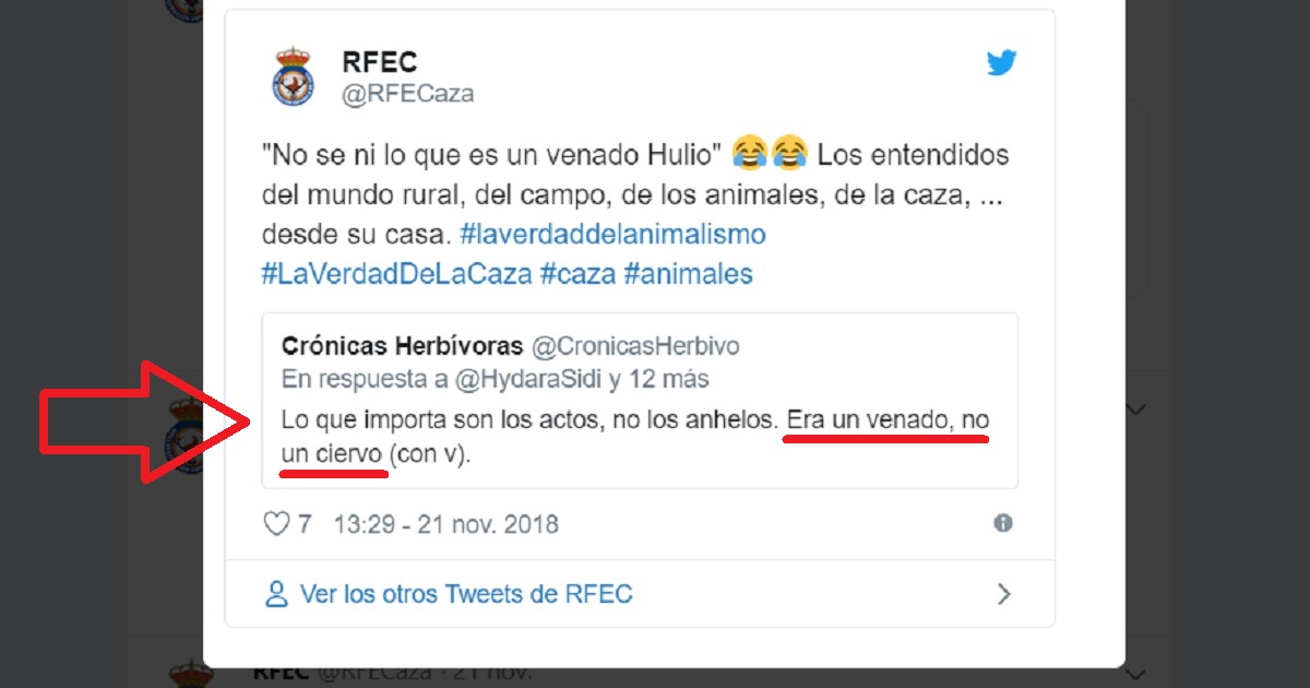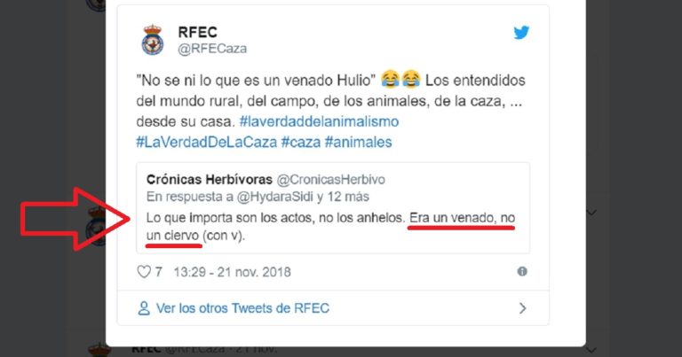 El perfil animalista Crónicas Herbívoras cargaba el pasado lunes contra un usuario de Twitter que escribió en la misma red social «no hay duda en que el cazador en ningún momento pretendió lastimar a sus perros y menos al pobre cierbo», respecto al vídeo en el que doce perros y un ciervo caen despeñados. Aprovechando el error ortográfico, Crónicas Herbívoras lanzaba un mensaje que se ha convertido en viral: «Lo que importa son los actos, no los anhelos. Era un venado, no un ciervo (con v)», respondió la persona que gestiona el perfil anticaza tratando de dar lecciones de ortografía. Pero lo que consiguió fue demostrar un profundo desconocimiento de la fauna ibérica, ya que como bien saben los cazadores, un ciervo y un venado son lo mismo. «Venado y ciervo es lo mismo, menos hierbas y más libros», le espetó otro usuario dejando en ridículo a los animalistas.