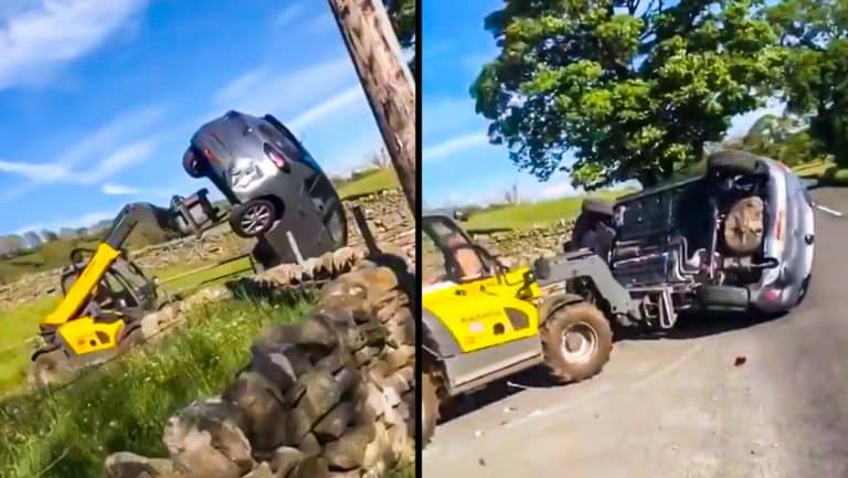 Según la prensa local, un grupo de jóvenes llegados desde la ciudad aparcaron en el camino de entrada de la propiedad, cortando el paso al resto de vehículos. Tras esto, los jóvenes se habrían enfrentado al granjero, provocando un monumental enfado. Como consecuencia, el granjero cogió una máquina telescópica de las empleadas para transportar y apilar la paja, se dirigió hacia el coche, y lo sacó de su propiedad hasta dejarlo ‘colocado’ en una pequeña carretera comarcal. Como consecuencia de la operación, el vehículo resultó destrozado.