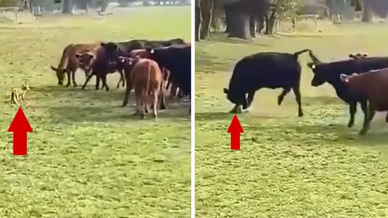 El vídeo que te mostramos a continuación comienza con la imagen de un zorro aparentemente joven frente a varias vacas que lo rodean. Segundos después una de ellas embiste contra el raposo, que cae al suelo pero se vuelve a levantar.