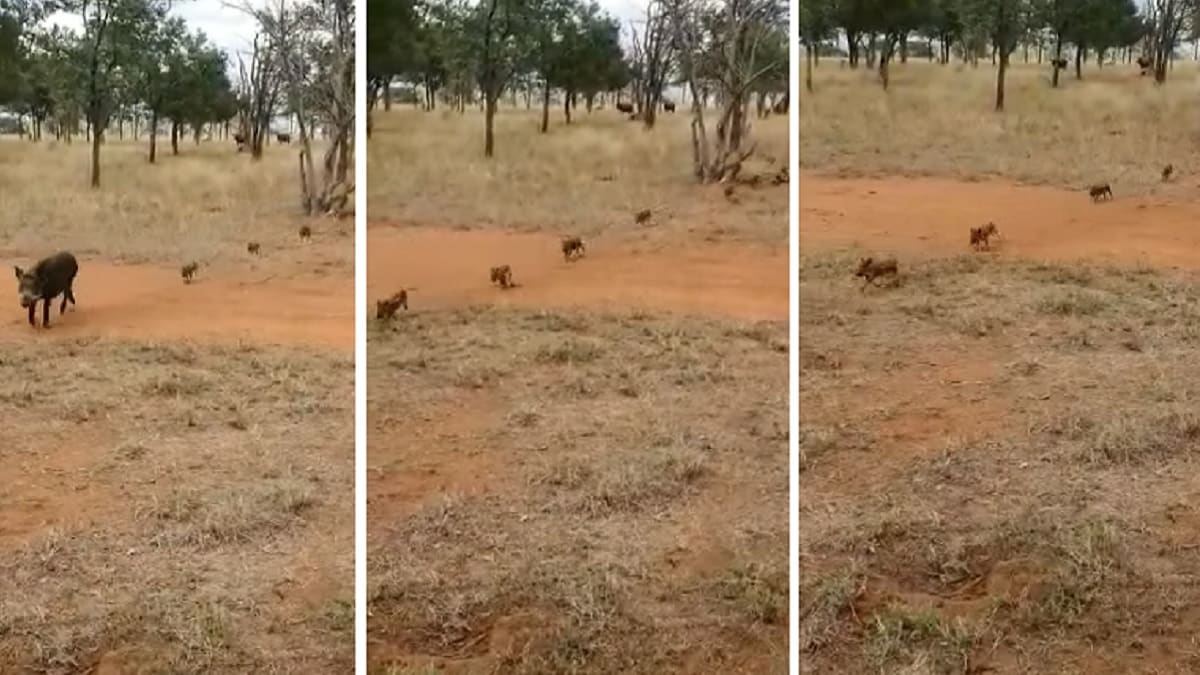 Una persona graba a una jabalina viniendo de frente con todo su ‘ejército’ de rayones tras ella. Uno a uno, se pueden contar hasta dieciséis de ellos, todo un espectáculo de la naturaleza y de un animal cinegético único en el mundo.