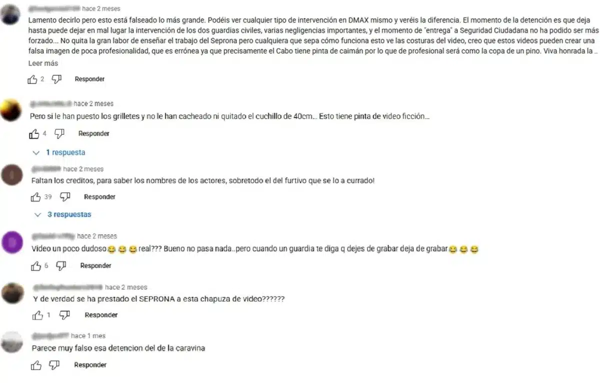 La escena, que imita el formato del conocido programa Seprona en acción, ha sido tachada por numerosos espectadores de un contenido «preparado». En los comentarios, los usuarios ironizan sobre la falta de realismo del vídeo. «Faltan los créditos, para saber los nombres de los actores, sobre todo el del furtivo, que se lo ha currado», escribía uno de ellos. Otro apuntaba: «Le han puesto los grilletes y no le han cacheado ni quitado el cuchillo de 40 cm… Esto tiene pinta de vídeo ficción».