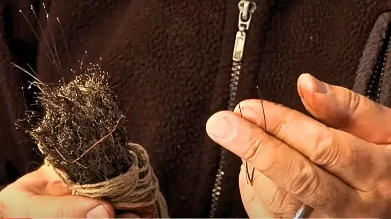 Lo que se hace con ellos, tal y como enseña el artesano, es trenzar de una punta a otra, bien prieto. Después de esto, se le aplica pez y cera virgen para que la hebra se deslice fácilmente. Así es como, con los pelos de jabalí, se fabrica el hilo muy resistente con el que se va a trabajar para fabricar los zapatos y fijar la suela a la piel del cuerpo del calzado.