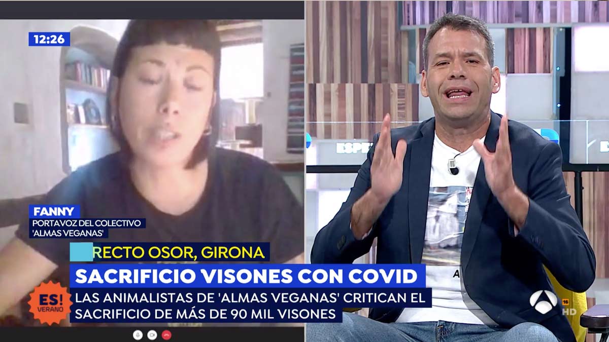 Durante su intervención, el periodista Rubén Amón tuvo ocasión de entrevistarla y plantearle una serie de preguntas que la joven fue incapaz de responder, demostrando la inconsistencia del argumentario vegano. La animalista exponía que todos los animales son personas. La piedra angular de su religión es el antiespecismo, o lo que es lo mismo, la creencia de que hombres y animales somos iguales y por eso no debemos comerlos. Con esta premisa, y aprovechando la cuestión de los visones, Amón le preguntaba: «Como en su opinión el animal es una persona… ¿Qué hacemos con el visón que se come a otros animales? ¿Tiene que concienciarse en comer verdura y fruta? ¿O el visón es una persona que puede comer a otros animales?».