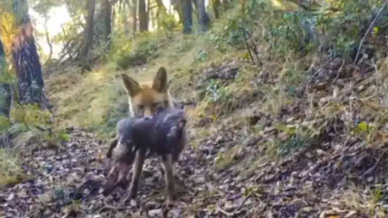 Aparece de frente, justo en la línea de la dirección a la que apunta la cámara. El zorro, como si supiera que lo están grabando, se para delante de ella y suelta el corcino en el suelo. Ahí se queda durante unos segundos descansando del esfuerzo que le supone transportar los restos de la cría de corzo.